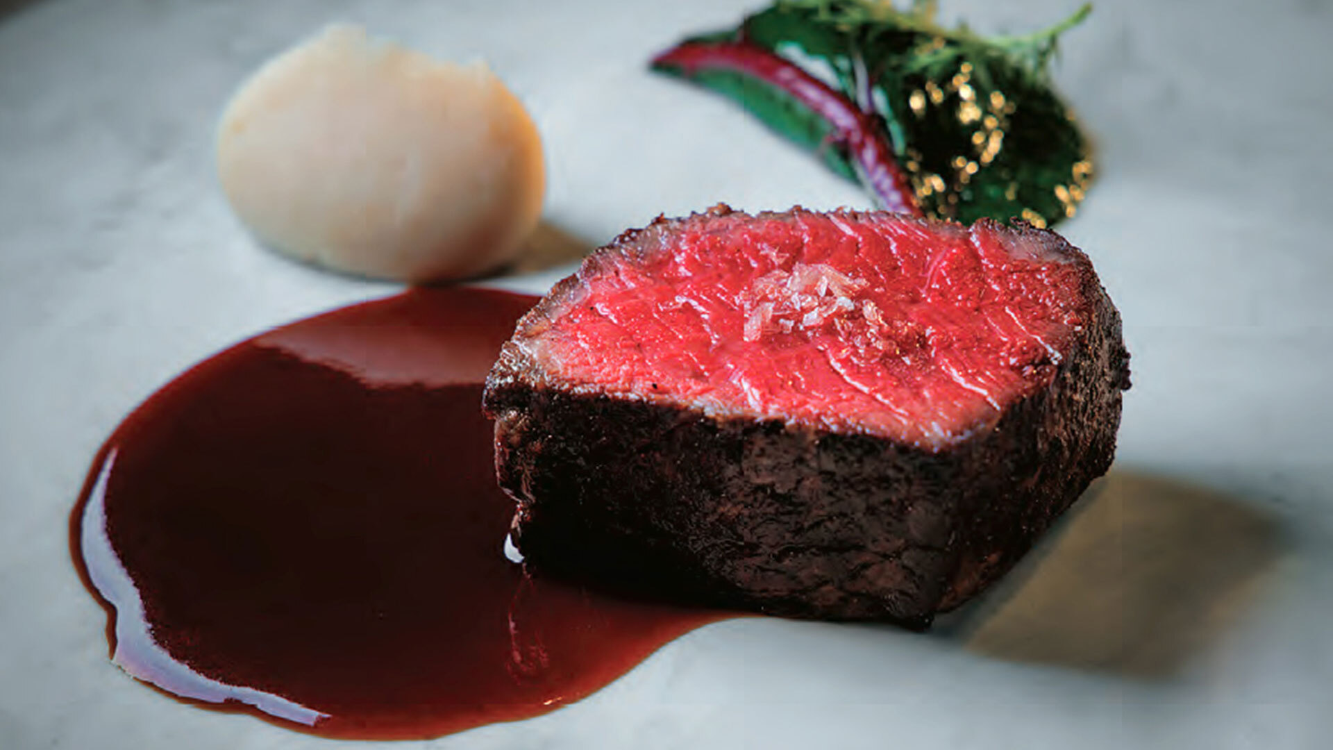 低温のオーブンで中は柔らかく、外側は香ばしく仕上げた「和牛内もも肉ロースト」。断面のコントラストも見事です。※料理はコース17,000円の一例