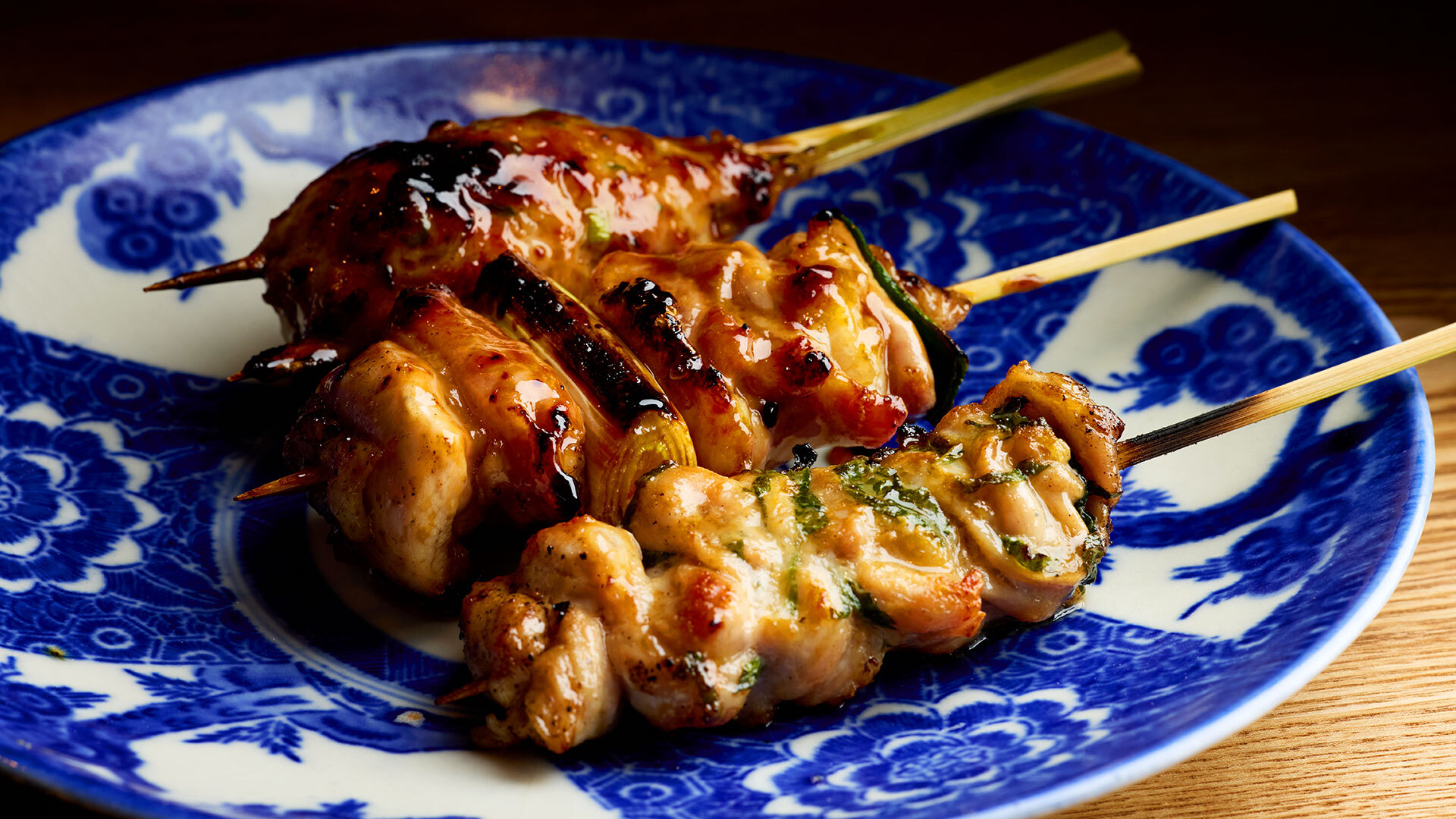 写真は手前から、大葉と柚子胡椒の爽やかな香りを添えた「せせり」、自慢のタレをまとった「ねぎま」、ボリューミーな「つくね」各¥440。