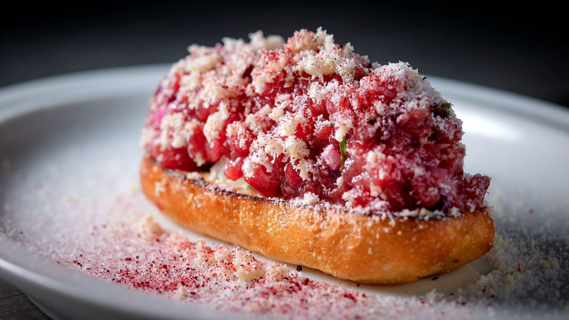 『malca』や『tens.』ののシグネチャーである、「クロスティーニ やま幸さんの本マグロのタルタル」¥1,800は焼き茄子やレフォール、ビーツを合わせて、味わいも彩りも独創的にアレンジ!