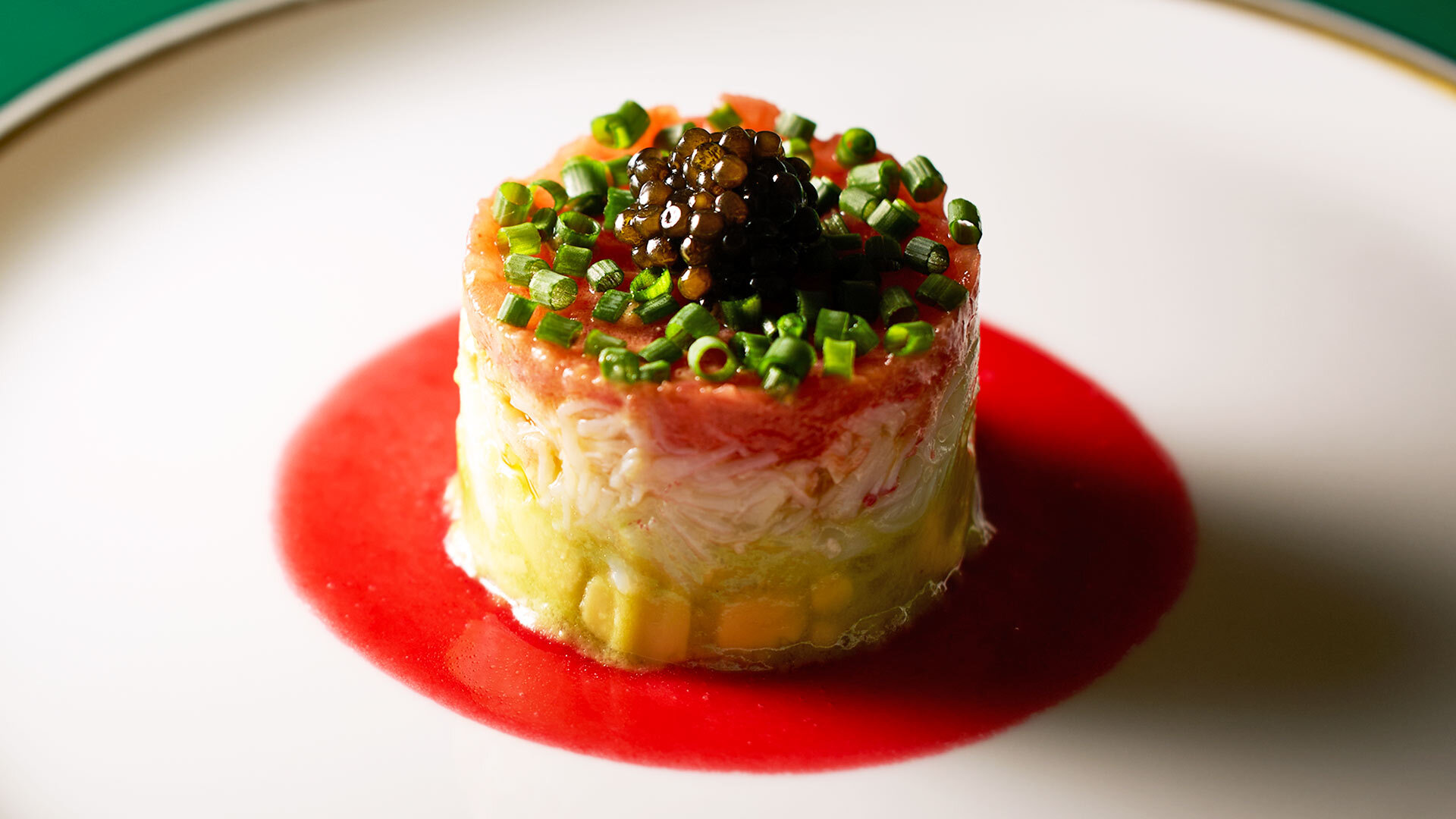 デートでぜひ味わいたいのが、人気コース「SPECIALE」¥18,600です。写真は開店当初からのスペシャリテ「蟹とアボカドのセルクル仕立てラズベリーソース」。