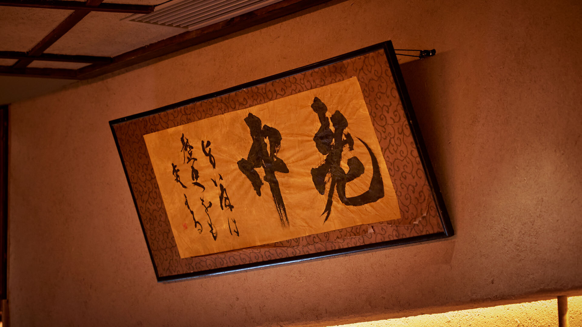厨房の上に飾られた額入りの書は、古美術品を愛するオーナーが日本文化へのオマージュを込めて作成したもの。