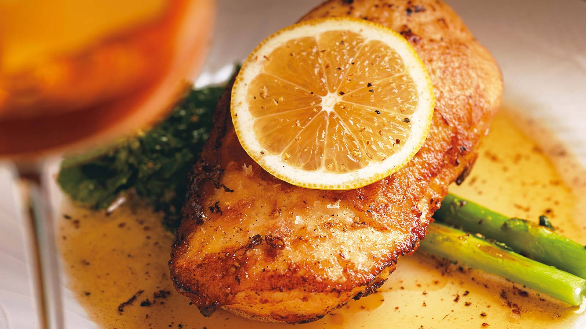 シグネチャーのひとつ「伊勢赤鶏の鶏バター」(¥3,300)は、無農薬レモンのソースが爽やかなひと品です。ブドウの皮の旨みがのった、ガルガーネガの白ワイン(グラス¥1,700)をペアリング。