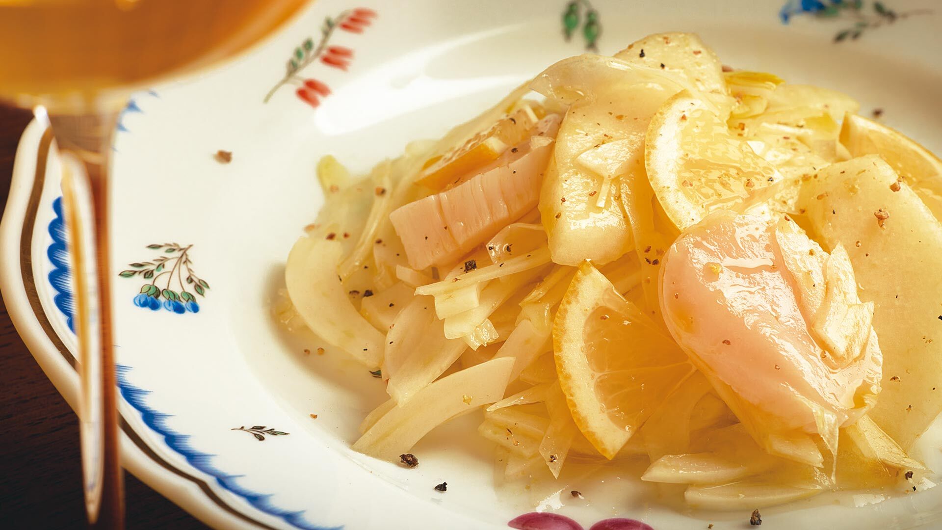 まずは、白に合う前菜から「ホタテとフェンネル洋梨のマリネ」(¥2,800)。さわやかな酸味でホタテの甘みが引き立ちます。