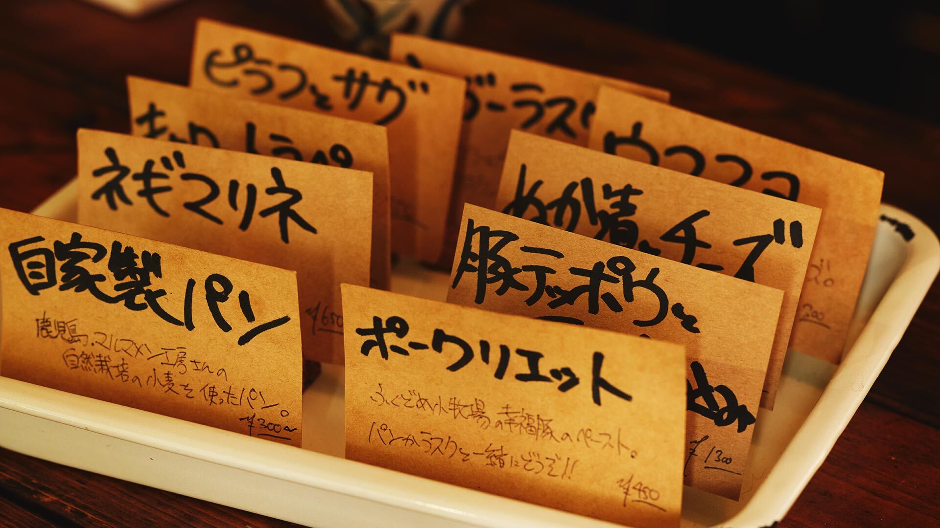 フレンチベースの料理は¥300からとリーズナブルで、カウンターに並ぶカードや黒板メニューから選ぶスタイルです。