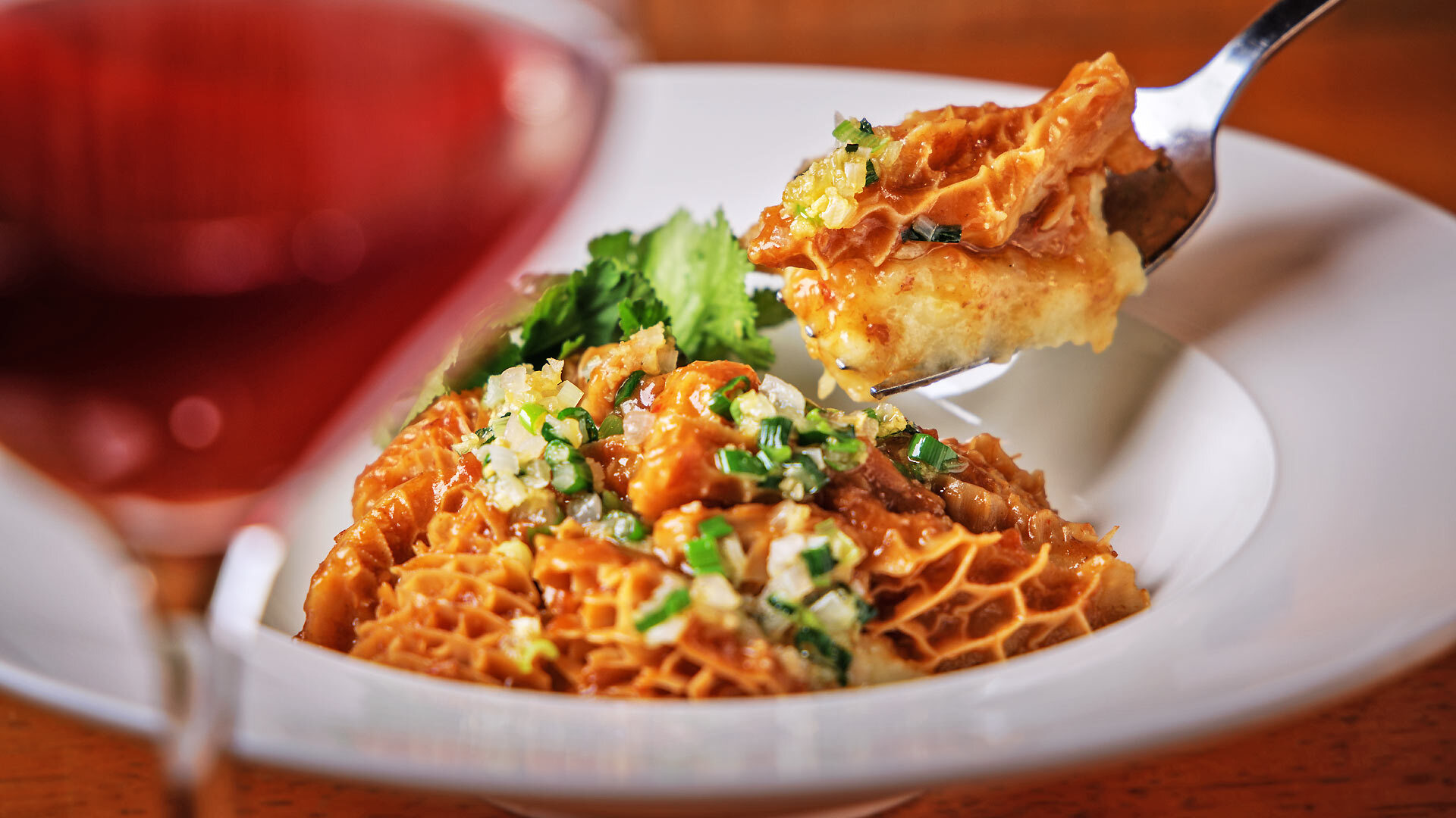 冷えたロゼワインと合わせたい「牛ハチノスのエスニックソース蒸し」(¥1,480)は、干しエビや味噌のソースとマッシュポテトの組み合わせがユニークなひと品。