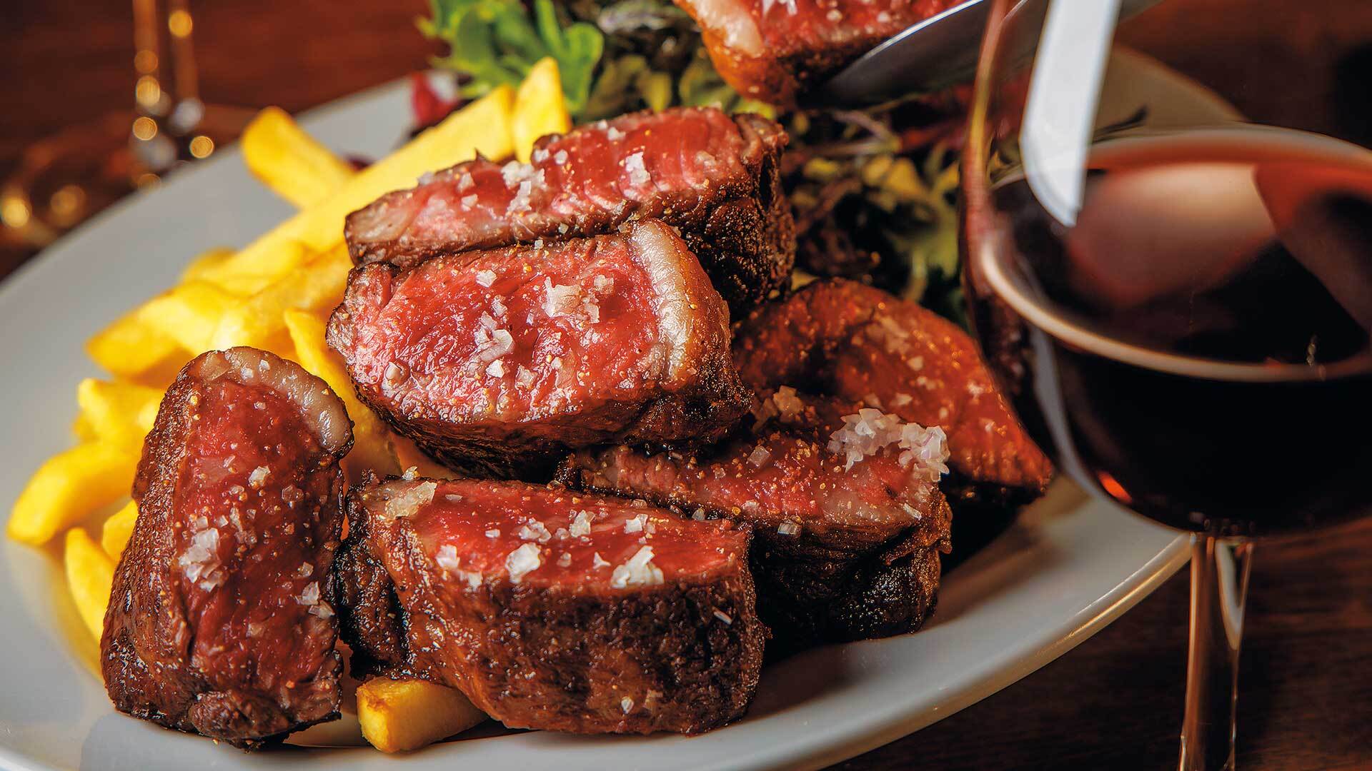 メインディッシュは、大迫力の「国産牛のロース ステークフリット」(¥4,800)。大きくカットされた300gの肉と山盛りのポテトが盛られ、ワインが進むこと間違いありません。