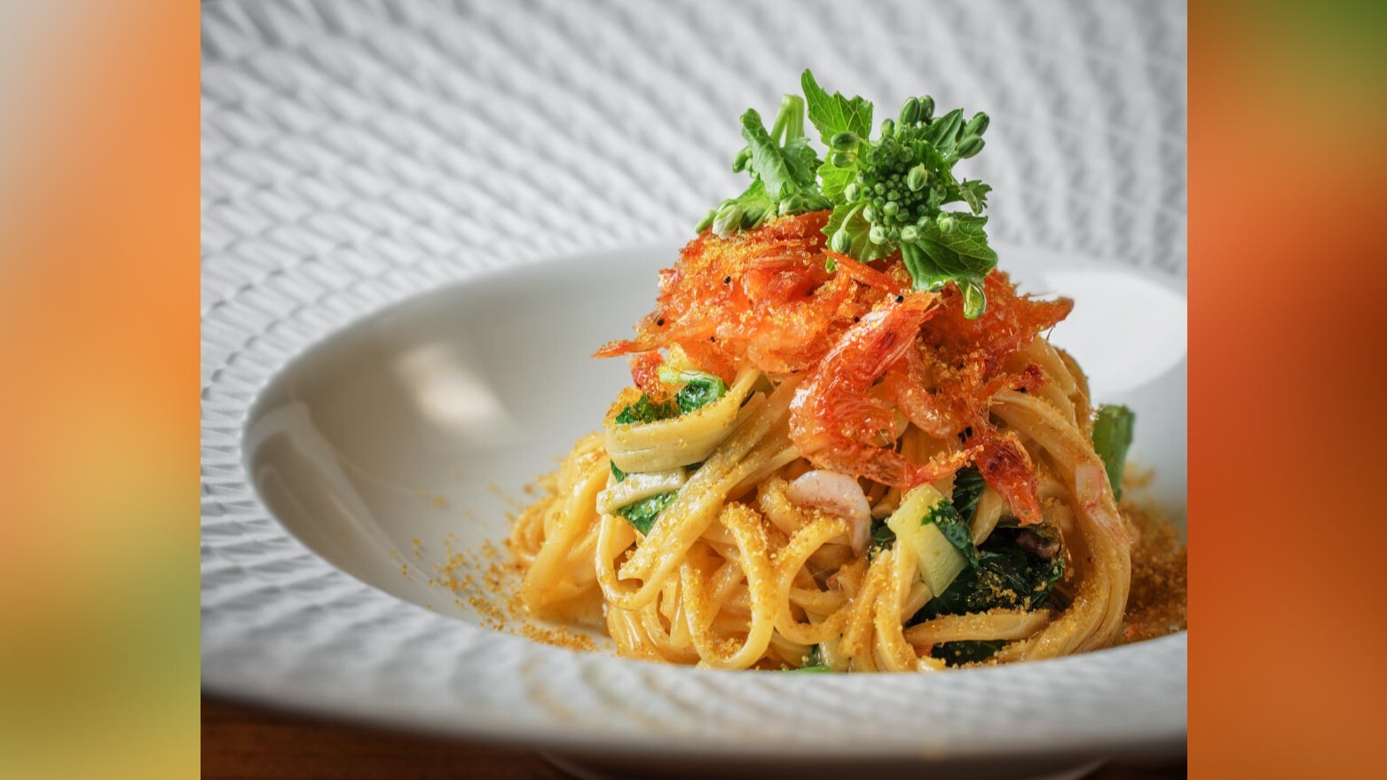 この日のパスタは、春の息吹を伝える食材を使った「桜海老」。駿河湾で揚がった桜エビと菜の花を合わせた、彩りも鮮やかな一皿。